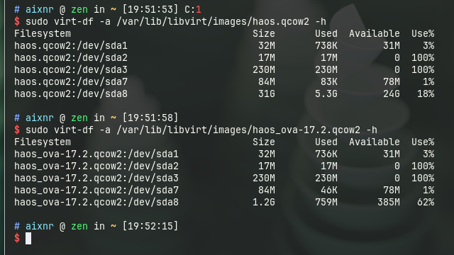 I first tried using virt-diff, but it did not return anything to the stdout, hence why I used virt-df.