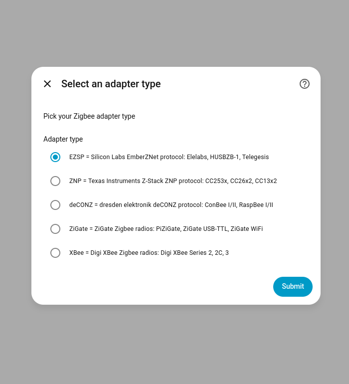 I knew the Zigbee adapter is identifiable at /dev/ttyUSB0 based on the sudo dmesg | grep tty output, with the identifying string cp210x.