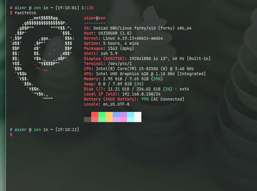 I also installed oh-my-zsh with git and fzf plugins enabled and to use ys theme, as well as lazyVim for a nicer nvim experience.